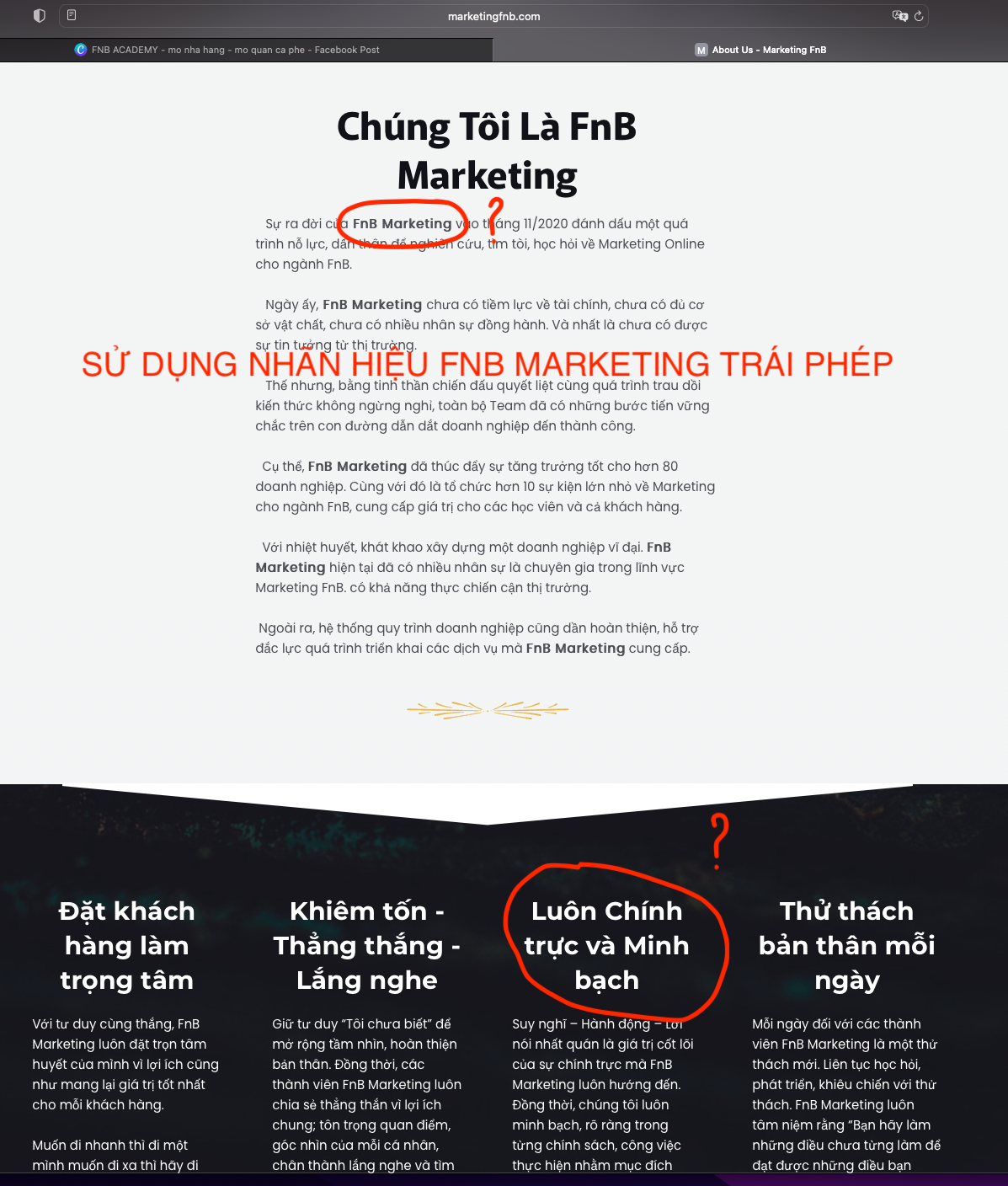 FnB Marketing® đã thông báo thông tin sử dụng trái phép nhãn hiệu với ban quản trị marketingfnb.com. Mặc dù phía marketingfnb.com đã thừa nhận việc sử dụng trái phép nhãn hiệu, hứa sẽ thay đổi việc dùng FnB Marketing như danh xưng trong hoạt động kinh doanh. Nhưng hiện tại website marketingfnb.com vẫn tiếp tục sử dụng thông tin nhãn hiệu FnB Marketing mà chưa có bất kì thay đổi nào.